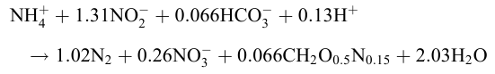 該反應以NH4+作電子供體,NO3-或NO2-為電子受體,將水體中的氮轉變成N2。厭氧氨氧化過程是在自養(yǎng)菌作用下完成,這種自養(yǎng)菌生成速度慢,泥齡長,但產生的剩余污泥量較少。厭氧氨氧化總的化學計量方程式: