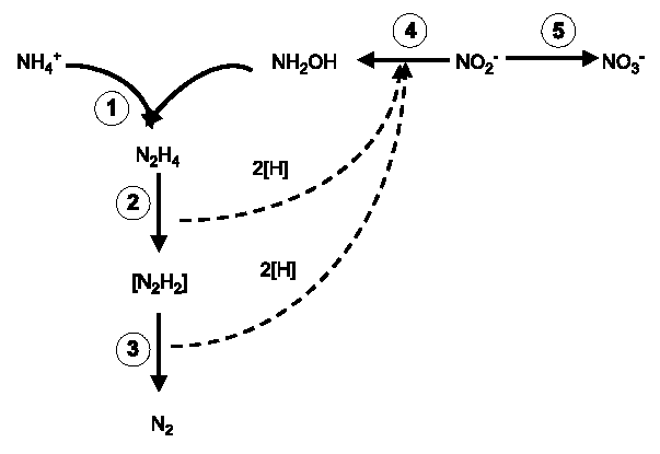 NH4+與羥胺氧化成聯(lián)胺,聯(lián)胺經過兩次脫氫氧化(2、3),最終生成N2。生成的聯(lián)胺與NO2-反應生成羥胺。